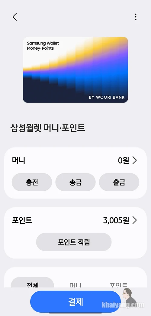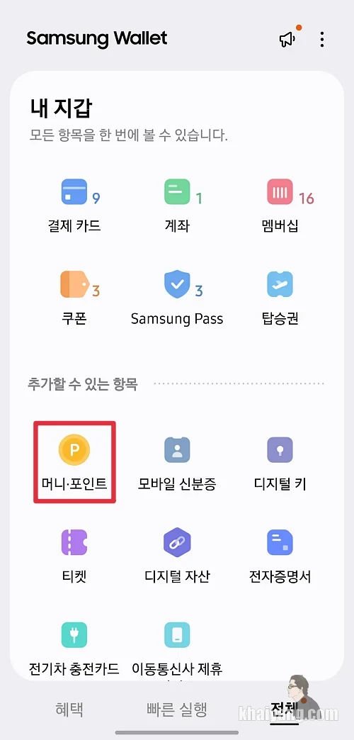 삼성월렛에서 하단 전체 부분을 선택하면 이렇게 메뉴에서 기존에 없었던 머니.포인트 항목이 생긴것을 알 수 있습니다.