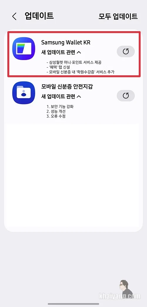갤럭시 스토어에서 업데이트 항목을 선택해서 삼성월렛을 업데이트 합니다.